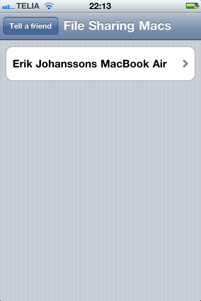 Som lösning på problemet har jag då funnit den underbara applikationen som helt enkelt skannar av ditt lokala wlan efter macar med fildelning påslagen. När den hittar en dator klickar du helt enkelt på den, loggar in med din vanliga dator-inloggning och väljer sedan vilka bilder du vill föra över. Svårare än så är det inte. inga sladdar och inget krångel.